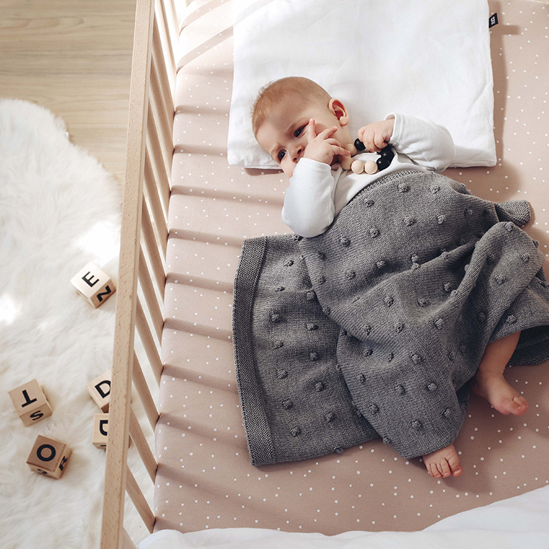 The other cause for celebration is our woolen blend Popcorn Pram Blanket, perhaps your baby’s best friend during winter months, which we continue this season in Grey, Sand and Strawberry Milkshake colourways as well as the ever popular cotton version in Snow. And while our blanket takes its name from the knitted bobbles that adorn the surface fit for covering baby in the pram, we also find it ooh soo charming in baby’s room, covering up those chubby little legs while she explores the visual and tactile wonder of the world around her.