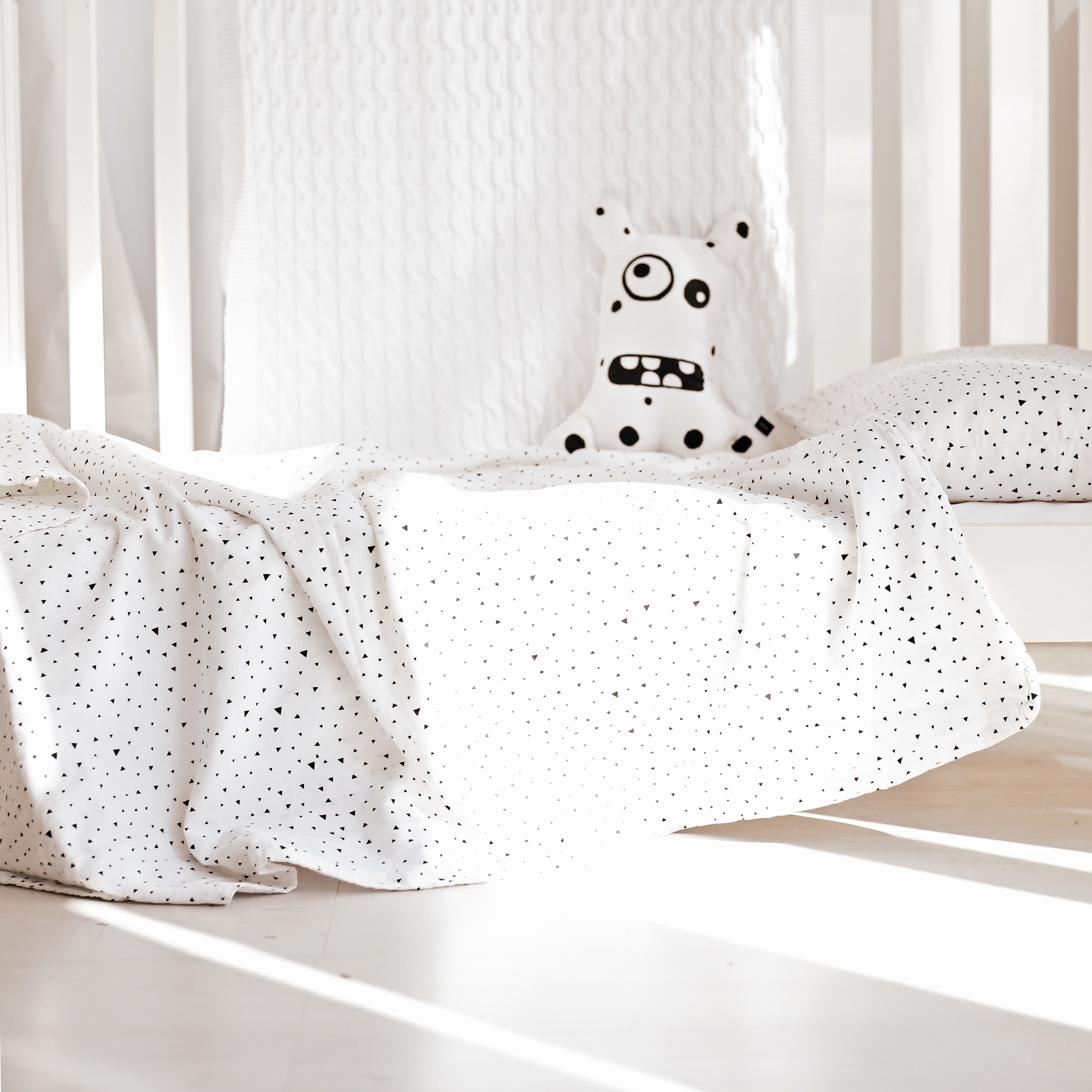 While its triangle pattern might be tiny, its effect is big. We print multiple sizes of small black triangles on a super-soft blend of linen and cotton. After we create your bedding, we prewash it so that it arrives to your doorstop nice and soft and ready to sleep in. Immediately.