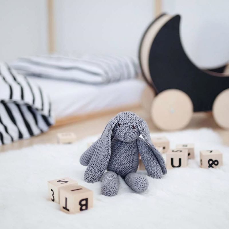 This adorable hand-crocheted bunny in chrome is the perfect cuddly companion for babies and toddlers. Made with love, it's gentle, huggable, and perfect for snuggles!