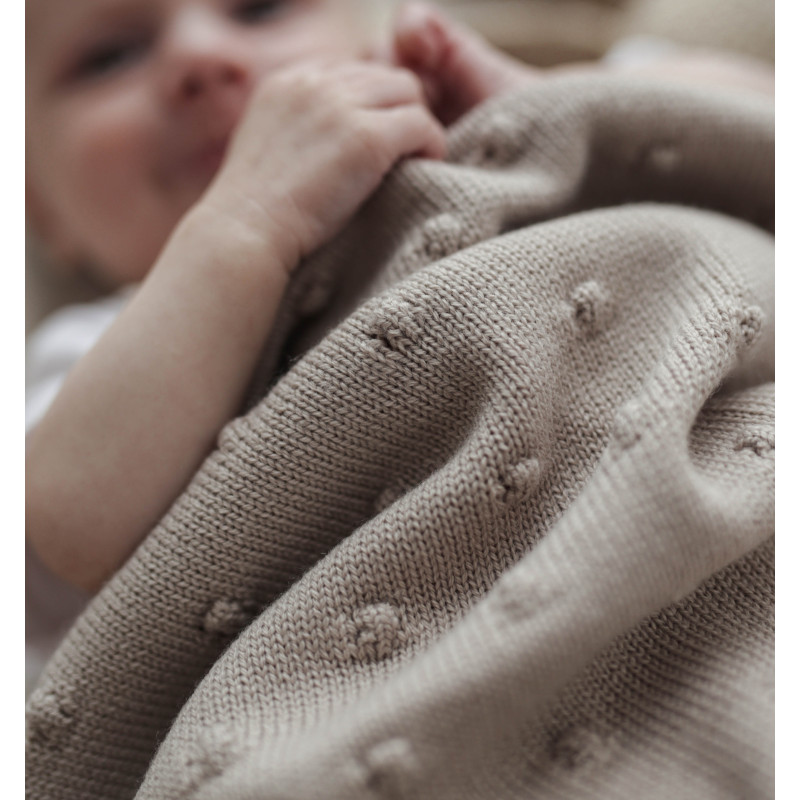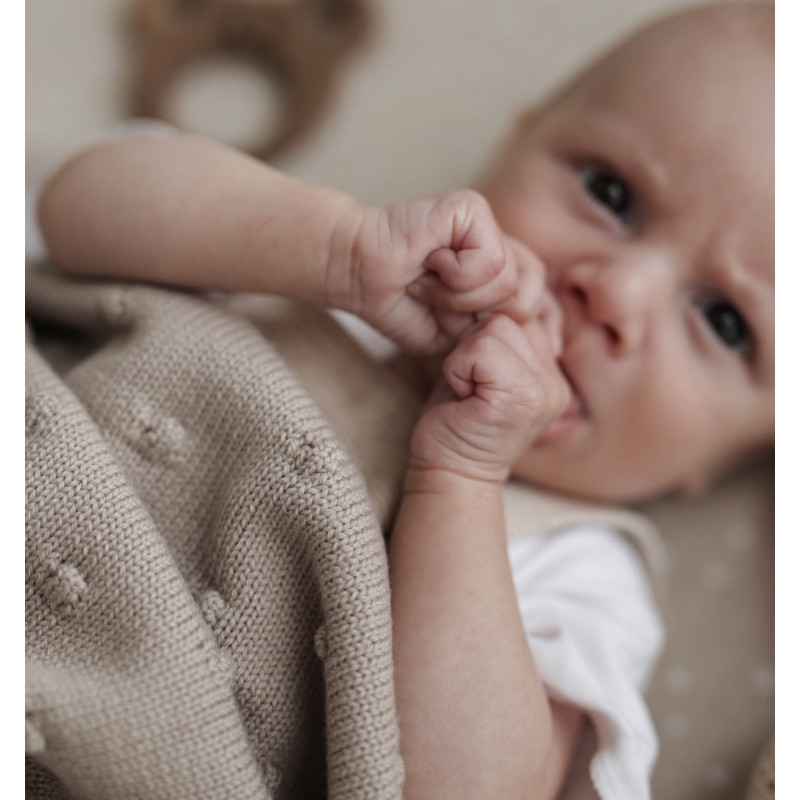 Ovijte svojega dojenčka v udobje in slog z mehko pleteno odejico, ki je čudovito okrašena z nežnimi “popcorn” detajli v peščenem odtenku. Popolna za uporabo v zibelki, vozičku ali avtosedežu, prinaša toplino in prijetno udobje kamorkoli greste. Njena teksturirana zasnova nudi tudi pomirjujočo senzorično izkušnjo za drobne roke, kar jo naredi prijetnega spremljevalca za vašega dojenčka, še posebej v hladnejših mesecih.