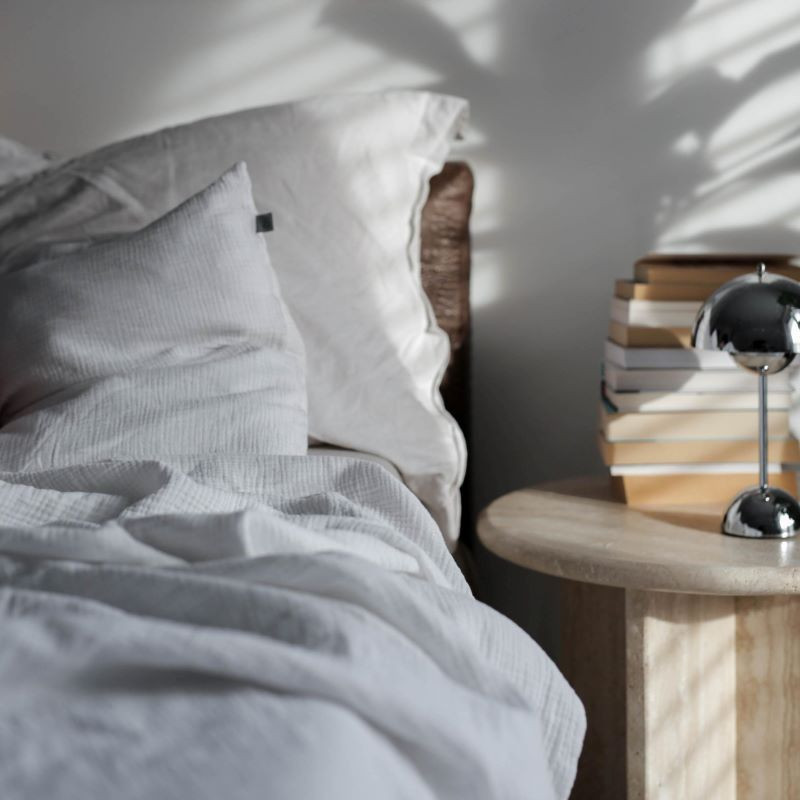 Posteljnina iz dvoslojnega bombažnega muslina je izjemno mehka, lahka in prijetna na dotik. Tkanina ima naravno rahlo krepasto strukturo, ki ji daje zračen in sproščen videz ter poskrbi za udobno spanje skozi vse leto.