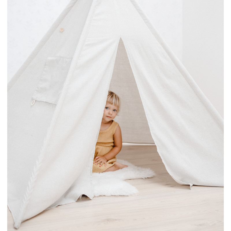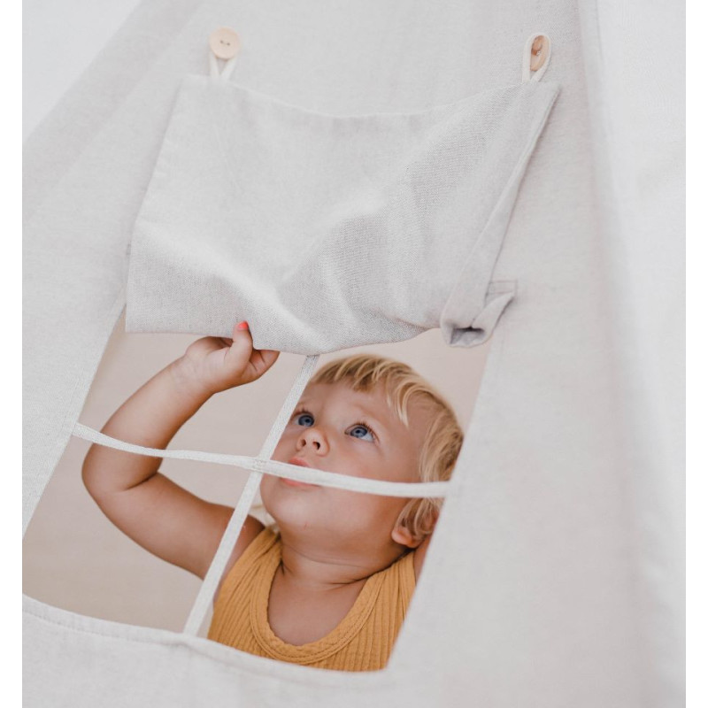 Otroci obožujejo šotore, tipije in pravljične utrdbe. Zaprti kotički jim dajejo občutek varnosti in pustolovščine, hkrati pa so prostor, kjer domišljija ne pozna meja. Večina šotorov je komaj dovolj velika za enega ali dva malčka, zato smo naš šotor naredili nekoliko večji – dovolj prostora za prijatelje, starše in kopico plišastih prijateljev. Preprosto ga je postaviti, polepša pa vsak kotiček doma. Je čarobni dodatek za vrt, dvorišče ali celo teraso. Lahko ga vzamete s seboj v park ali na plažo in ga uporabite kot zavetje pred soncem za vso družino. Stransko okno je kot vrata v skrivnosten svet – idealno za igro skrivalnic in skrivanja, hkrati pa pomaga, da šotor ostane prijetno hladen.