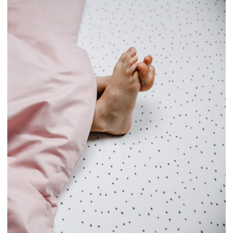 Izjemno mehka rjuha iz čistega bombažnega jerseya, ki jo enostavno nataknete na vzmetnico. Vzorec naključnih črnih pik na belem ozadju se elegantno poda k vsem našim prevlekam za odeje in vzglavnike.