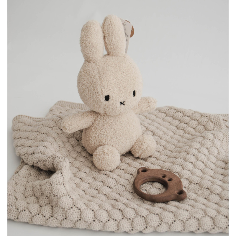 Bež Miffy zajček s mehko odejo Nest in naravnim lesenim grizalom Chunkey Monkey, skrbno zapakiran v prestižno darilno škatlo – popolno darilo za novorojenčke in ob baby shower priložnostih.