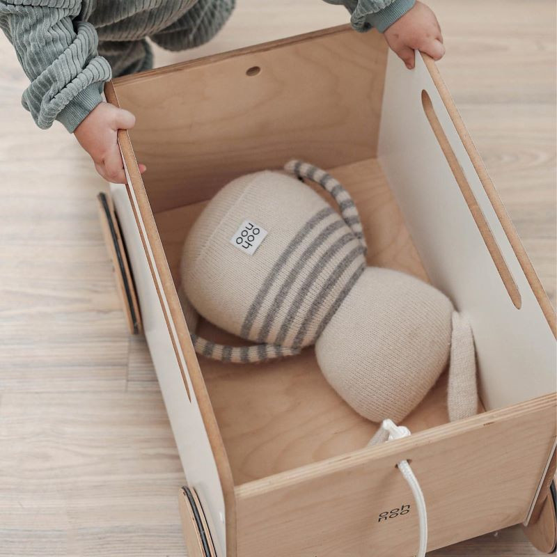 All Aboard! We've taken the same great design of our toy pram and applied it to the concept of a toy cargo wagon. This handmade wooden toy chest is a simple wagon and comes with a rope so that you can pull it along or attach it to other wagons.